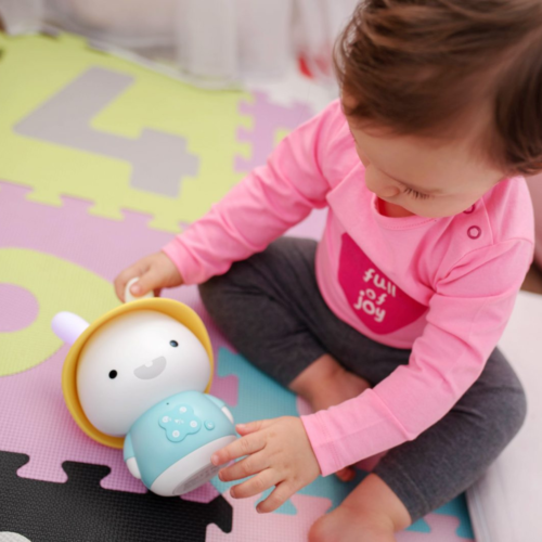 Dzięki swojej zdejmowanej, żółtej, silikonowej czapeczce oraz świecącym uszkom, Króliczek gwarantuje świetną zabawę! Podobnie jak reszta jego rodziny, czyta bajki i śpiewa piosenki. Możesz połączyć Baby Bunny za pomocą Bluetooth z dowolnym urządzeniem i odtwarzać ulubione utwory Twojemu Dziecku.