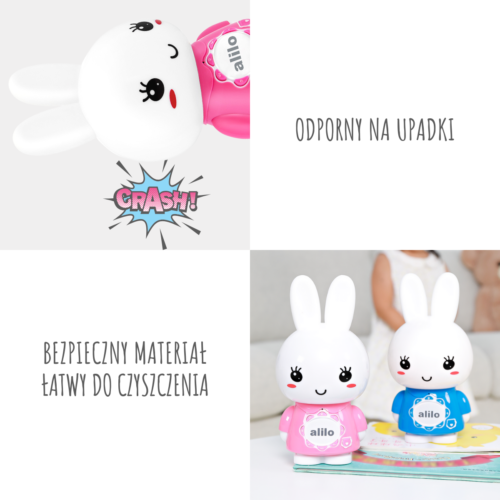 Bezpieczeństwo dzieci gwarantują atestowane materiały. Natomiast dzięki specjalnemu wytrzymałemu tworzywu ABS, które jest 30 razy mocniejsze niż zwykły plastik, króliczek jest odporny na wstrząsy i upadki.