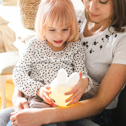 Miękkie uszy króliczka świecą delikatnym światłem zmieniającym kolory, a jego cała głowa podświetla się ciepłym światłem dodając otuchy przy zasypianiu.