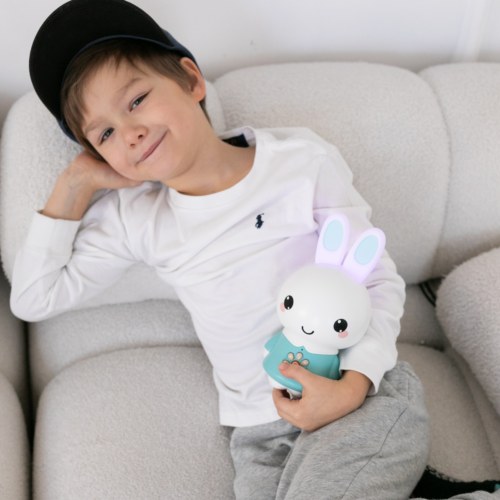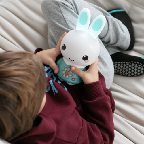Miękkie uszy króliczka świecą delikatnym światłem zmieniającym kolory dodając otuchy przy zasypianiu.