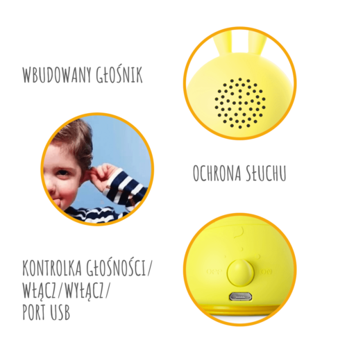 Miękkie uszy króliczka świecą delikatnym światłem zmieniającym kolory i dodają otuchy przy zasypianiu.
