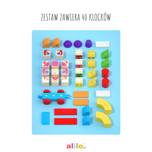 • różne kształty klocków (w tym sześciany, płytki, łuki, walce, element z ruchomymi kołami, elementy z zaokrąglonymi kształtami) – pozwalają na tworzenie płaskich i przestrzennych figur, a także na konstruowanie liter alfabetu i cyfr